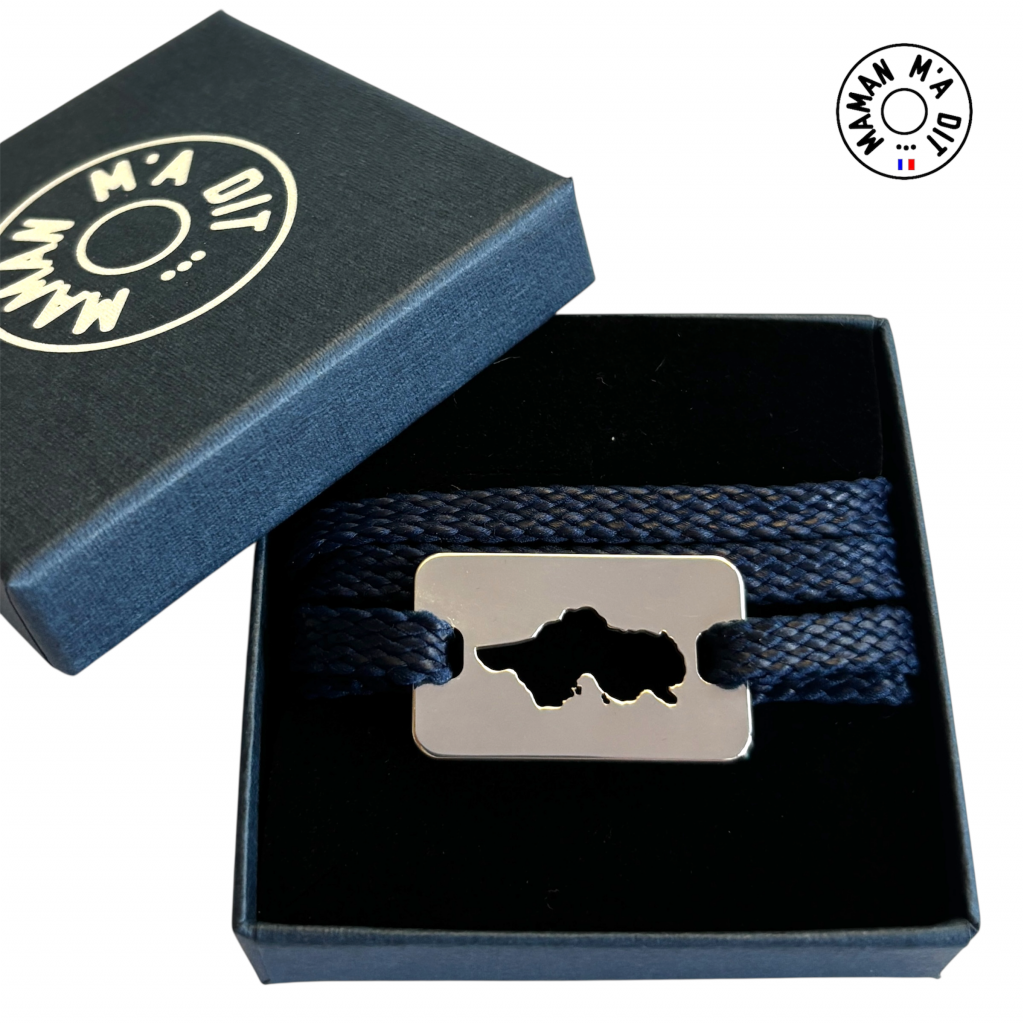 Bracelet Tunisie ajourée médaille 19x30 mm. Possibilité d'ajouter un prénom gravé et de représenter d'autre pays. Finition lanière polyester en option