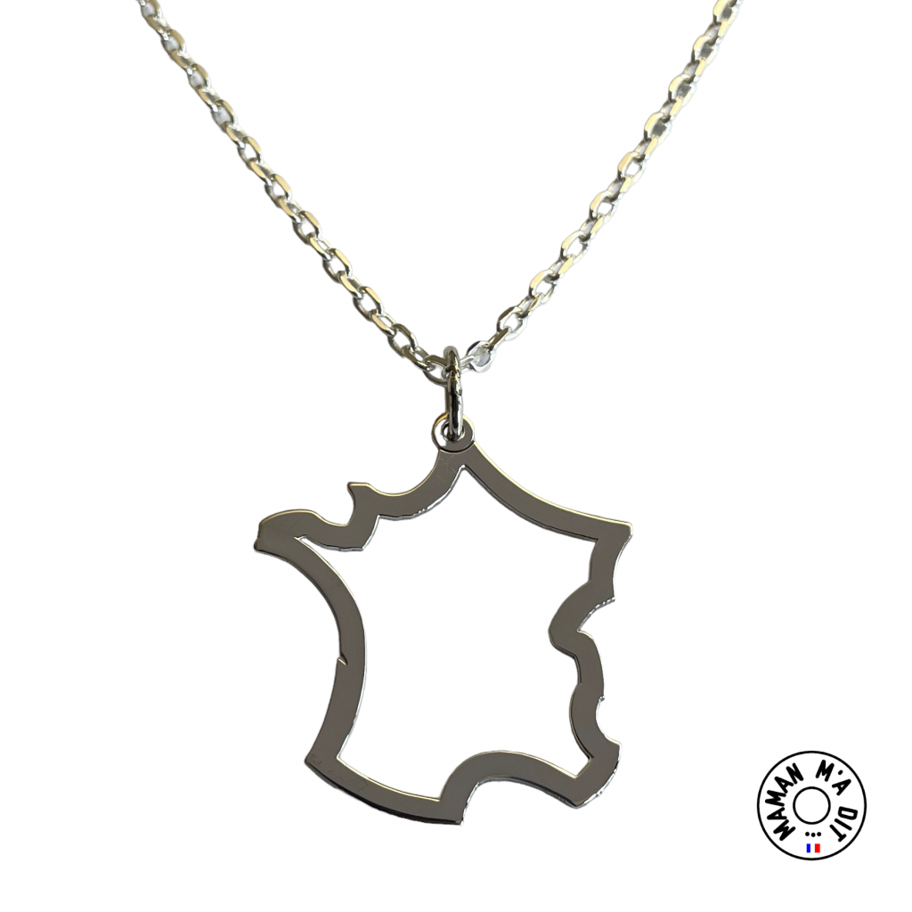 Collier carte de France 33 mm, montage sur chaine en option. Cordon classique 2 noeuds coulissants offert