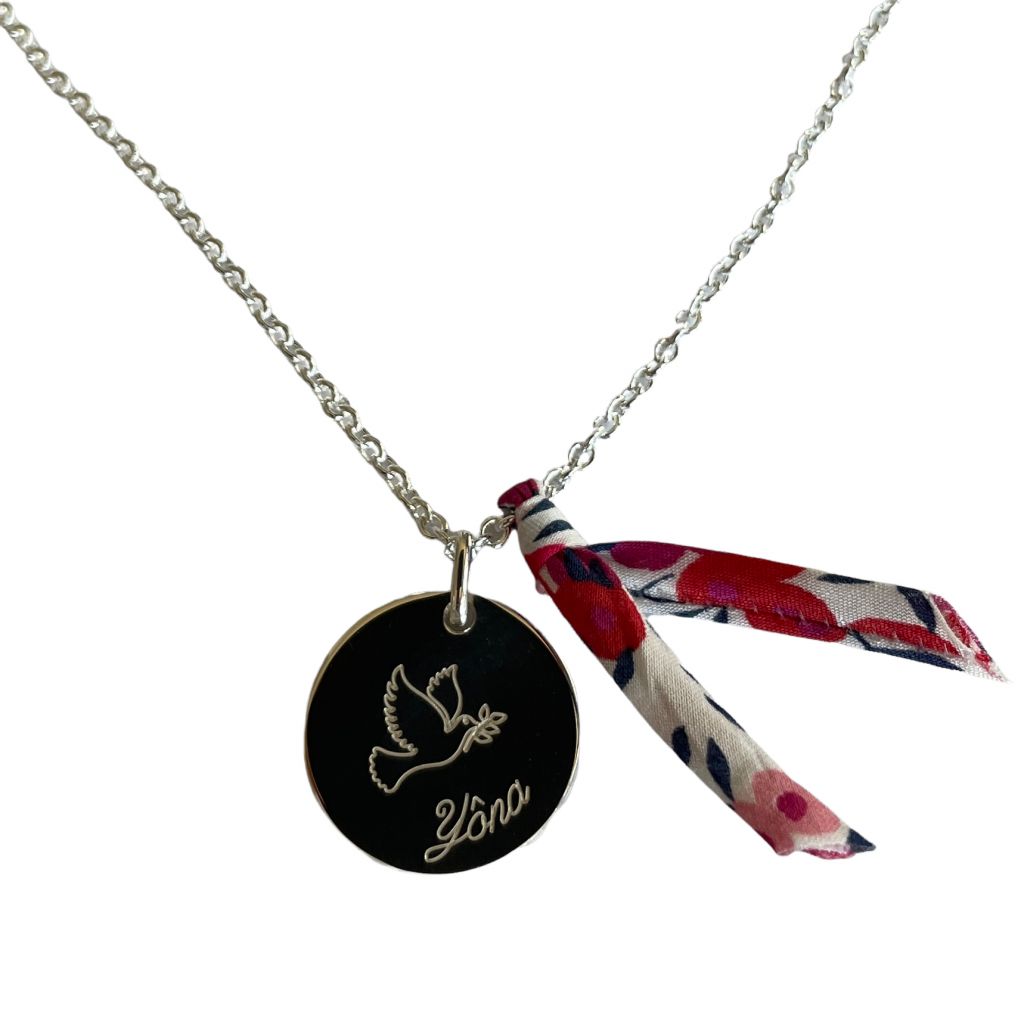 Collier colombe an argent monté sur chaîne. Ajoutez une petite douceur en choisissant la couleur de votre noeud Liberty Gravure au choix